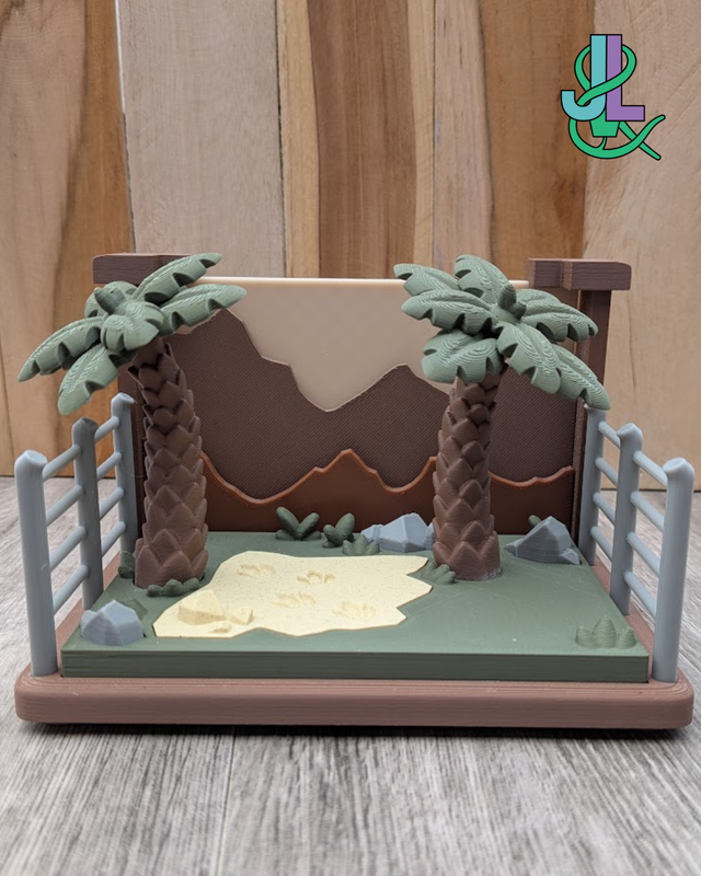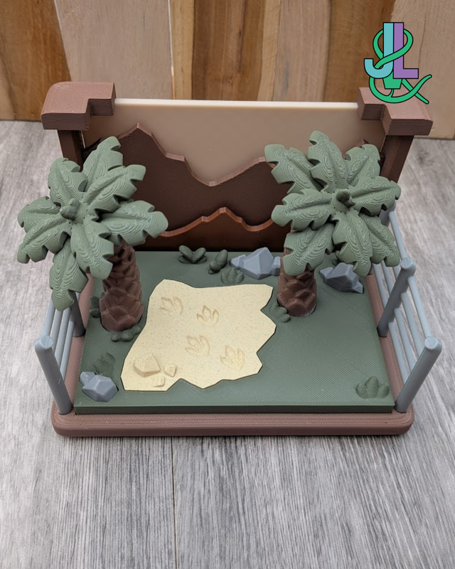 Stap in de magische wereld van de dinosaurussen met dit schattige 3D-geprinte Dino Verblijf! Dit unieke setje is perfect voor iedereen die dol is op dinosaurussen en graag een eigen mini-jungle creëert. Het verblijf is voorzien van een houten omheining, palmbomen, en een speelse omgeving waar je dino's zich helemaal thuis zullen voelen.